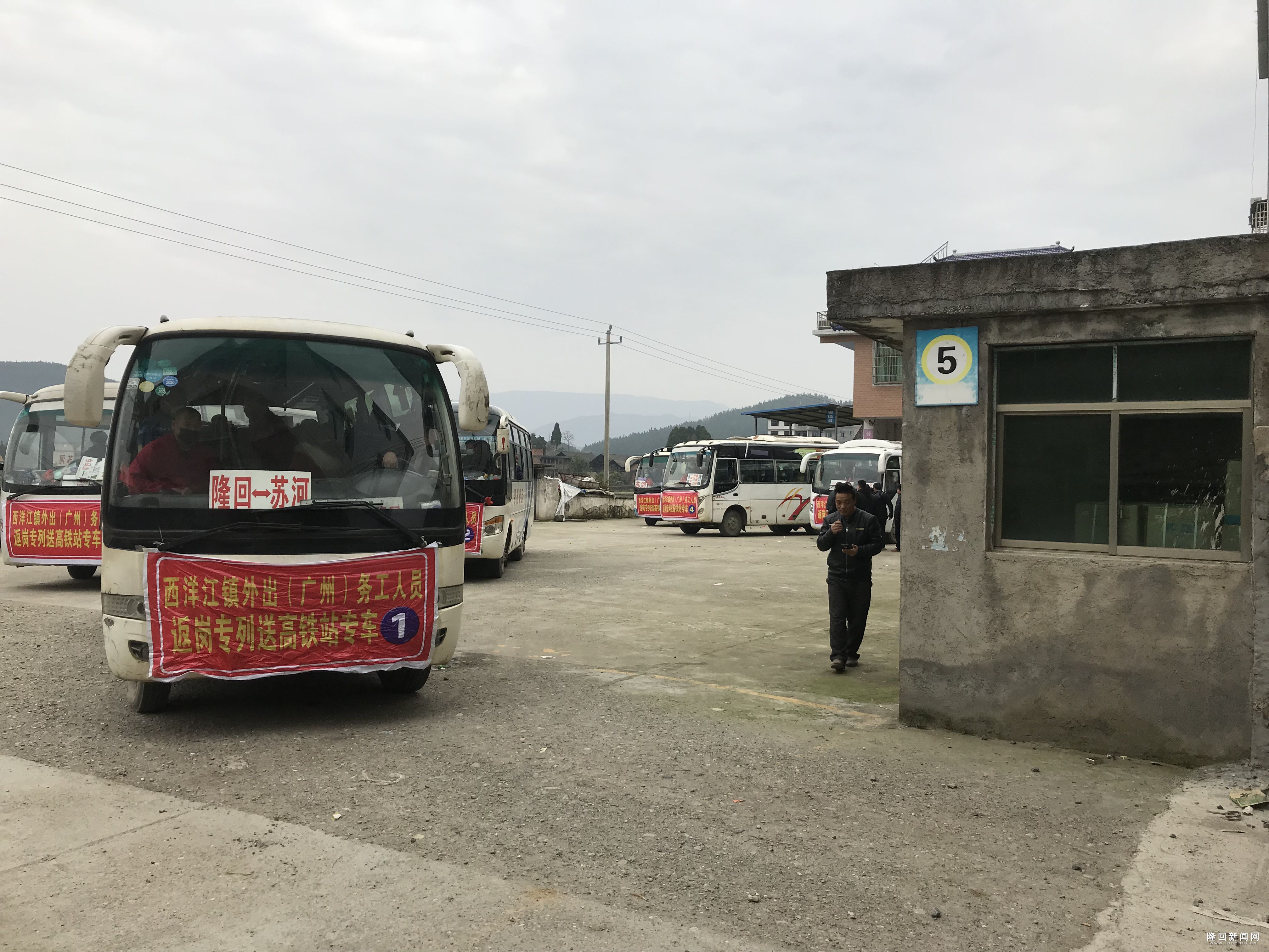 3月15日上午8点,9辆悬挂”西洋江镇外出(广州)务工人员返岗专列送高铁站专车“红色条幅的班车,依次缓缓从西洋江镇汽车站驰出,前往隆回县高铁站。