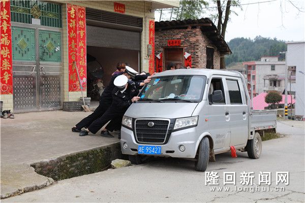 当天15时许,隆回县公安局交警大队交管中队民警在巡逻至周旺镇斜岭村路段时,发现一辆灰色轻型栏板货车半边轮子陷在路旁沟渠里,动弹不得。交警立即上前查看情况,经了解,由于驾驶人不了解该路段地形一时失误将车陷进了路旁沟里。交警在观察车辆周围情况后,联合周围热心群众找来砖块、石头垫在车轮下,增加车轮与地面的摩擦力,并让驾驶人在车内掌握方向,大家一起合力在车右侧用力推,成功将受困车辆解救出来。