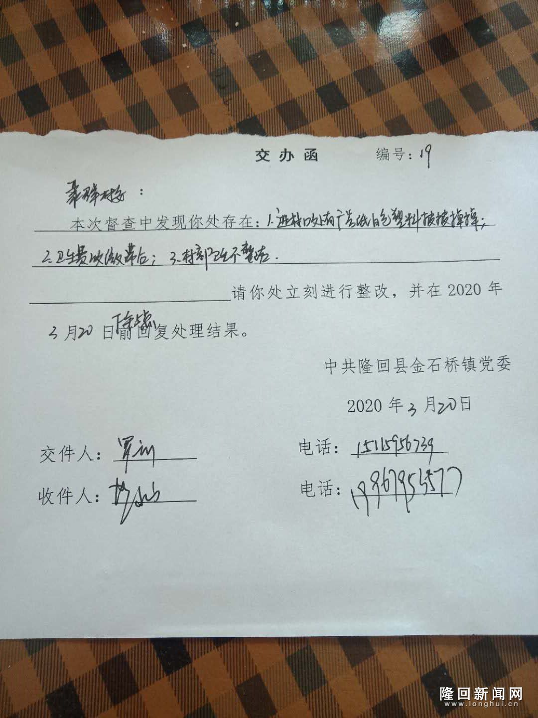 隆回新闻网讯(通讯员 贺小山 马健)3月20日上午,隆回县金石桥镇党委委员胡建璞带队对聚群村进行了人居环境整治“三大行动”的日常督查,并根据督查的情况开出了交办函。聚群村委会严格按照督察组的要求,上午督查,下午整改到位,并举一反三,助力人居环境整治“三大行动”。