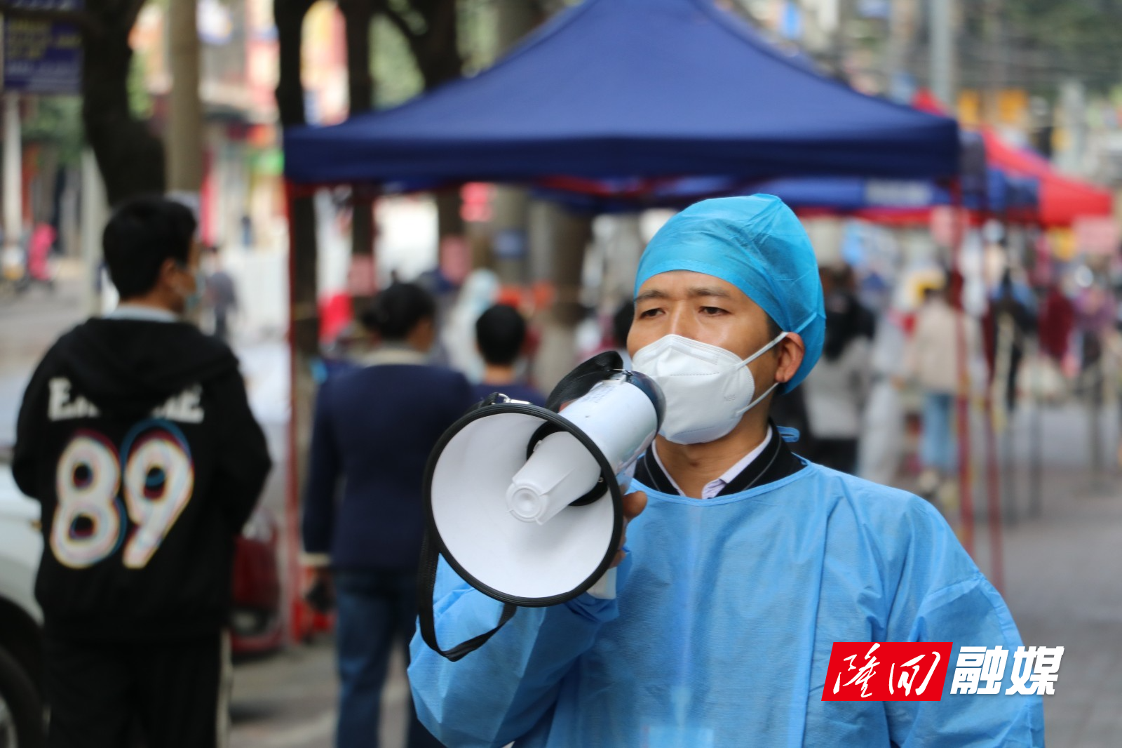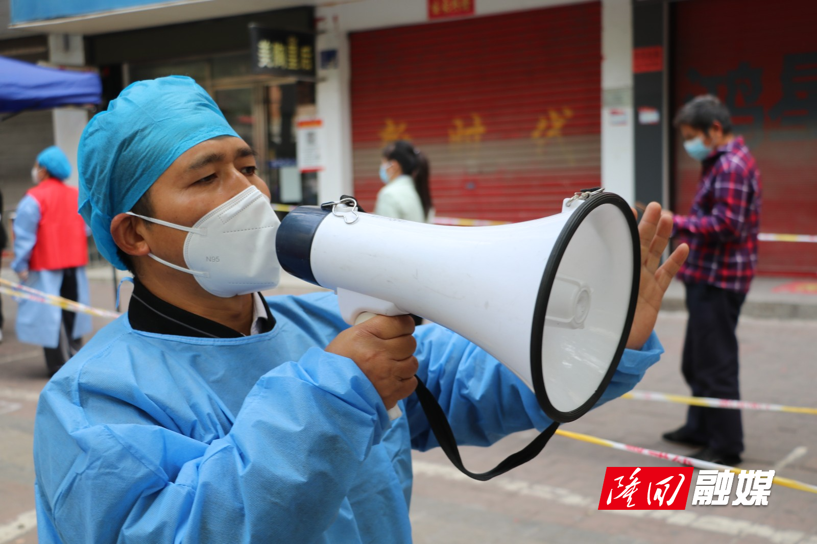—分享— 隆回新闻网讯(通讯员 罗理力)“请大家带好口罩,间隔2米”11月4日上午,隆回县大桥路38号核酸检测点,志愿者马道胜手持喇叭,忍住脚痛,坚持指挥社区居民有序进行核酸检测。 来源:隆回县融媒体中心 作者:罗理力 编辑:陈红